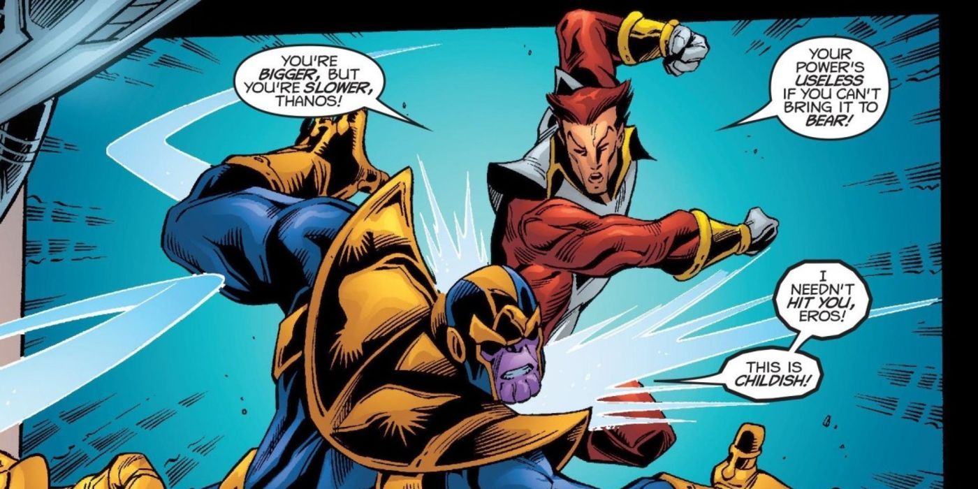 According to Marvel Eros is the youngest son of two Eternals ALars and Sui-San. The youngest son of Mentor and Sui-San Eros had the natural ability to excite pleasure in others but his power had no effect upon his mutant older brother Thanos who worshiped the cosmic. In the Marvel comics Thanos leads an attack on Titan that leaves their mother dead a loss that leads Eros to take life more seriously.